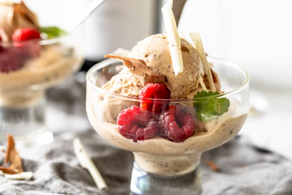 - Kom massen på en ismaskine eller hæld det i en form som sættes i fryseren, hvor det er en god ide, at røre i den hver halve time de første 2 timer, så der ikke dannes iskrystaller i isen.