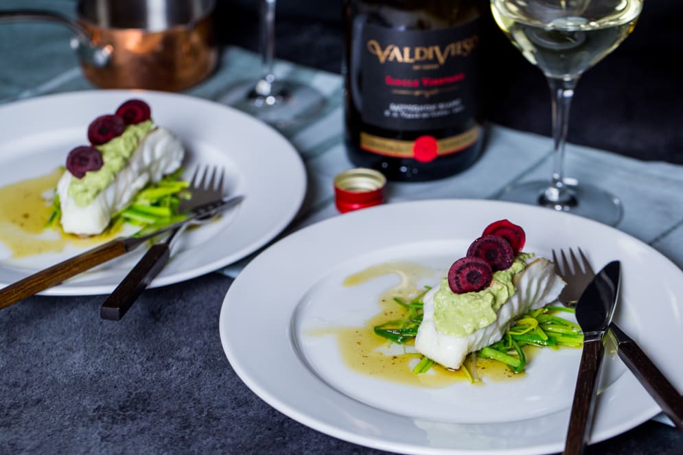 - Opvarm ovnen til 180 grader. Hæld vinen i et ovnfast fad, og placer torskestykkerne i fadet, som tilberedes i ovnen i ca. 10 – 15 minutter. For, at tjekke om de er klar kan man sætte en kød nål i et torskestykke, og dernæst på læben. Er nålen varm er de klar.